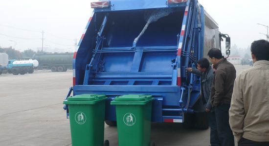 选装多种翻桶(斗)机构 不同用户可根据不同的垃圾搜集方式,选装不同的翻桶(斗)机构:翻标准垃圾铁桶ZBT59003-88(300 L)、塑料垃圾桶(240L)、随车小垃圾斗、密封遮盖式垃圾斗、大垃圾斗。