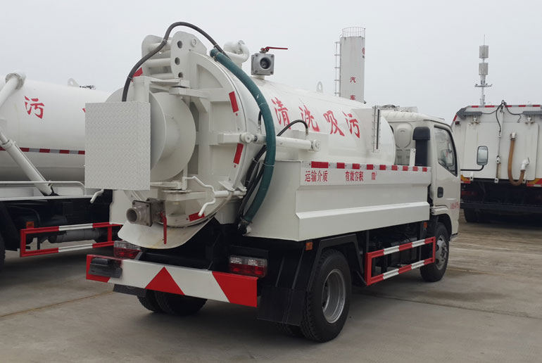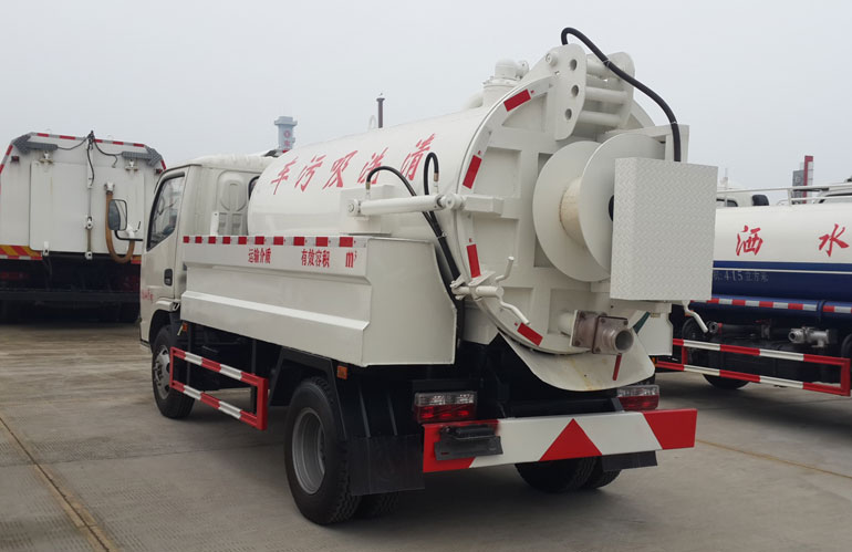水罐罐体有效容积:1.5立方米,运输介质: 水,密度:1000千克/立方米,罐体外形尺寸(长×直径)(mm):1500×1200。吸污罐罐体有效容积:1.74立方米,运输介质: 液态污物,密度:900千克/立方米,罐体外形尺寸(长×直径)(mm):1600×1200。水罐和吸污罐为两个独立罐体,清洗功能时用水罐, 吸污功能时用吸污罐,清洗吸污两种功能不同时使用,两罐不能同时满载。防护材料:Q235A碳钢,连接方式:左右侧面及后下部防护均采用焊接连接,后部防护断面尺寸(mm):100×50,后部防护离地高度(mm):430。随底盘选装前面罩,前保险杠,前组合灯具.ABS厂家及型号:襄阳东风隆诚机