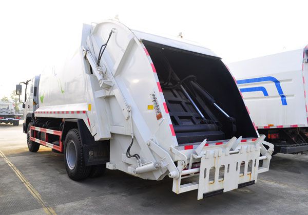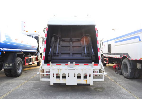 ⑨ 方便的操作控制 作业控制盒分别安装在驾驶室内和车尾,驾驶室内的作业控制盒可控制推挤卸料和选择操作模式(如自动或手动),车尾的作业控制盒则控制压填机构和翻桶机构的作业,使用操作十分方便。特别是在垃圾填埋场,作业人员无须下车即可完成卸料和污水排放。