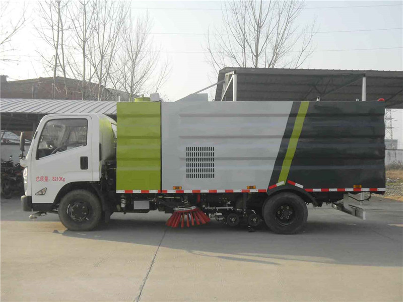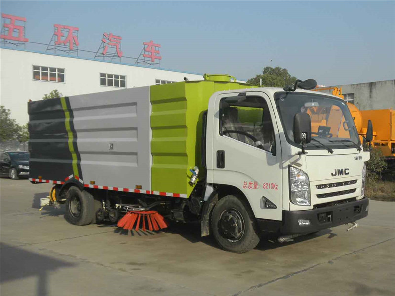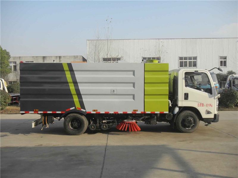 随底盘选装选装前雾灯,车顶换气天窗,不装前雾灯外观见选装照片;ABS系统型号:VIE ABS-II,ABS系统生产厂家:上海万捷汽车控制系统有限公司;侧面防护装置为专用装置,后下部防护装置,材料:Q235,连接方式: 螺栓连接,断面尺寸(mm):100×50,离地高度380 mm;主要功能:扫路,路面清洗;专用装置:扫刷,吸盘。